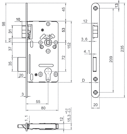 Korridortürschloss mit Flüsterfalle, falz, Klasse 2, Falle, Riegel aus Zinkdruckguss, Nuss aus Kunststoff, mit Wechsel, 2-tourig EAN 4002730112301