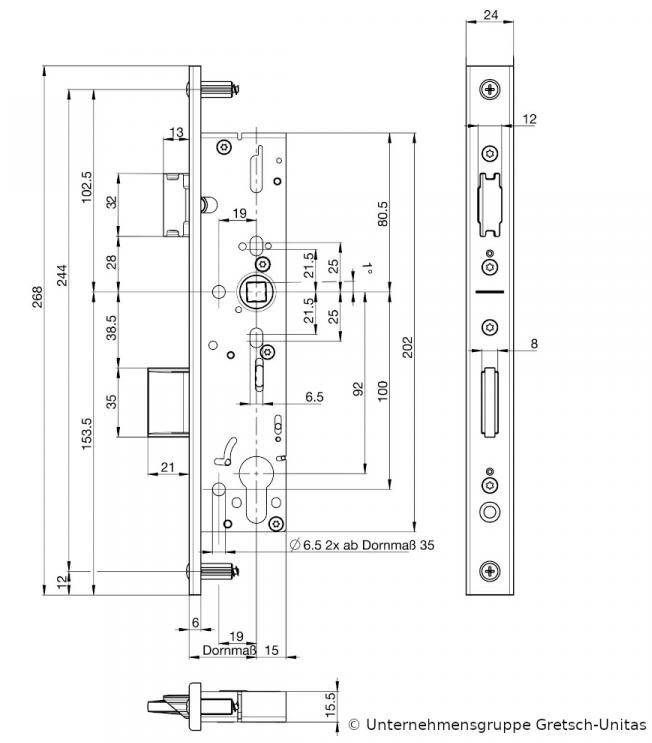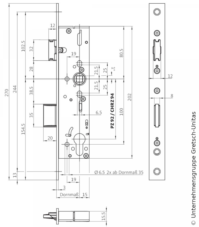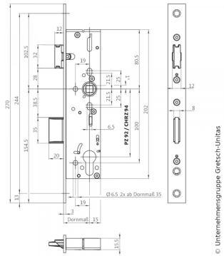 BKS Feuerschutztürschloss B-1828 DLS/DRS 35mm Dorn 24x3x270, BKS-18280-35-92-9-FH