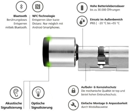 Das Herzstück der Anlage. Er ersetzt Ihren mechanischen Zylinder und ist für den Innen- und Außenbereich geeignet. Er bietet höchste Sicherheit durch Aufbohr- und Kernziehschutz sowie ein integriertes Secure-Element für Ihre Daten. Lässt sich der Zylinder bei einem Umzug anpassen? Ja, er ist modular verlängerbar.