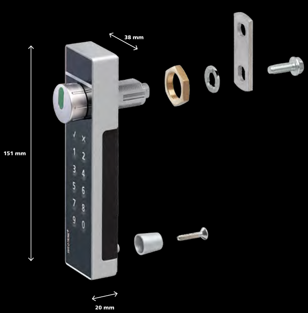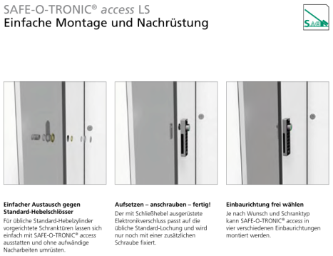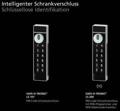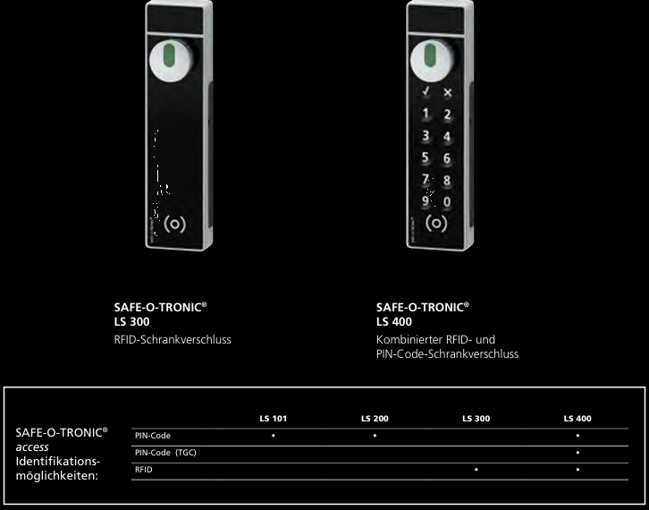 Schlüssellos – per PIN-Code Der persönliche PIN-Code lässt sich bequem durch leichtes Berühren der Tastenfelder eingeben. Die Programmierung der Schließanlage mit MasterCodes ist optional auch zeitsparend per RFID Card möglich. ISO 14443 A, RFID-Schloss SAFE-O-TRONIC® ACCESS LS300, Farbe Schwarz, Drehknopf rund, MIFARE
