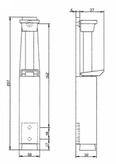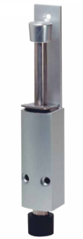 Türfeststeller mit Konterfeder, dunkelbraun Kunststoff beschichtet, 60mm Hub, Gehäuse aus Leichtmetall, sämtliche weiteren Metallteile aus Stahl, galvanisch verzinkt, Stopfen aus Gummi-schwarz