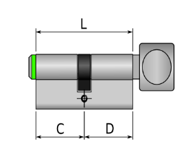 runder Knauf mit Griffmulde auf Länge 2 (D) montiert.